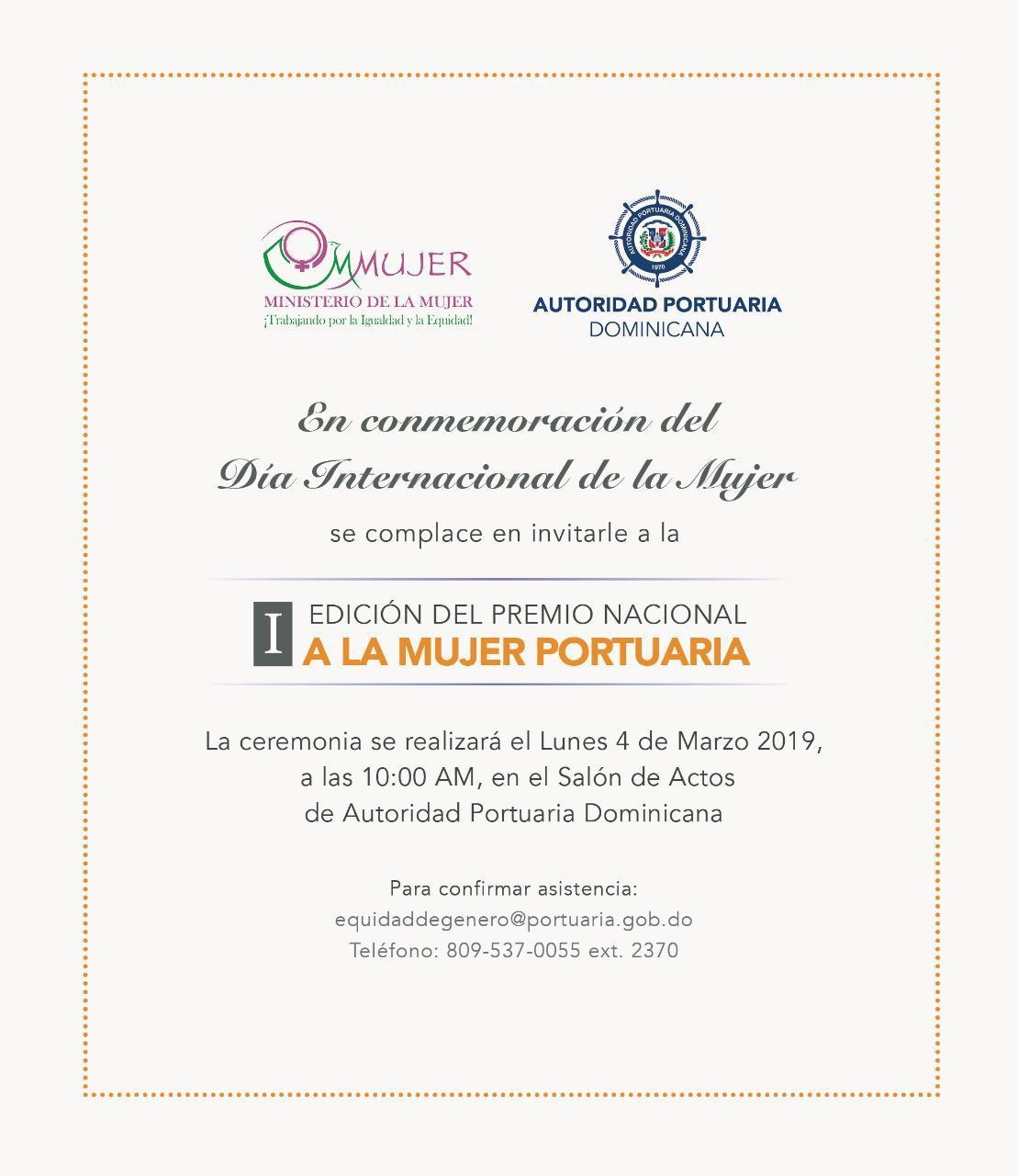 En ocasión de conmemorarse el próximo Viernes 8 de Marzo, el Día Internacional de la Mujer, en *Autoridad Portuaria Dominicana* conjuntamente con el *Ministerio de la Mujer* estaremos realizando hoy a las 10:00 AM en nuestro Salón de Actos, la Primera Edición del *Premio Nacional a la Mujer Portuaria* donde serán Reconocidas las principales y más destacadas Mujeres del Sector Marítimo y Portuario de nuestro país.