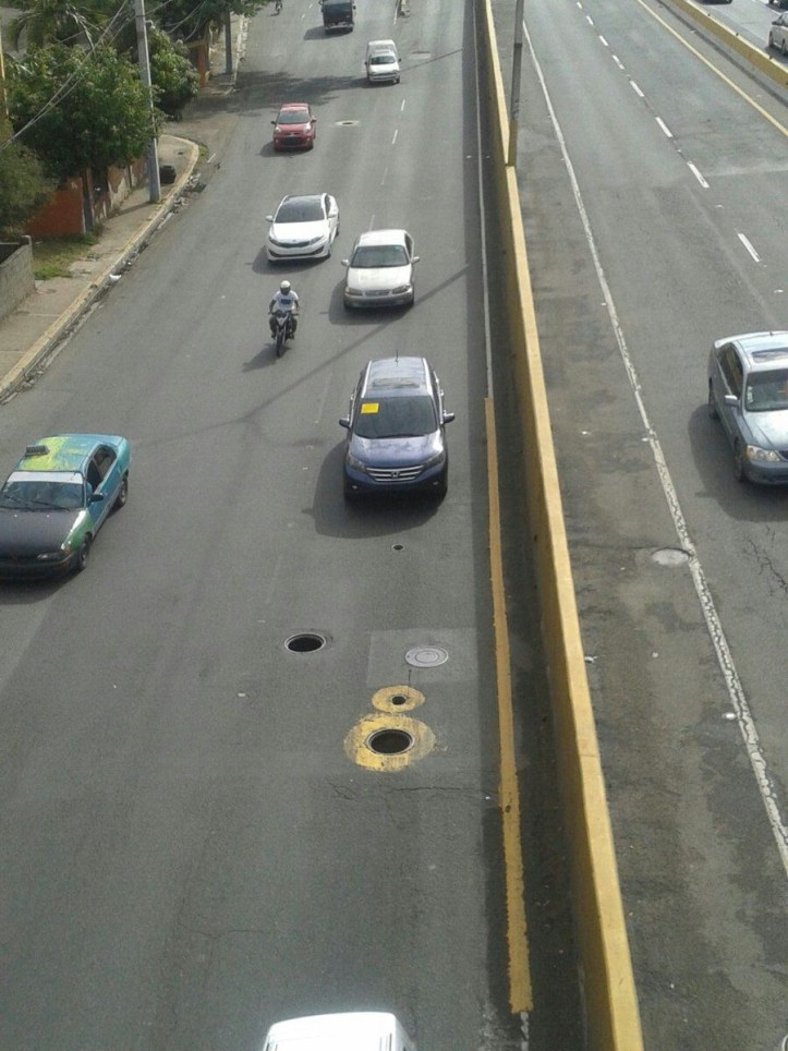 Santo Domingo Este hoy en la autopista la América serca al hospital Dario Contrera casi debajo del pueste peatonal hay unos tremendo oyó que puede producir un accidente muy grave a la autoridades favor corregir esto en muchas ocaciones se ven esto problema tiene que buscar la solución definitiva a este problema debe haber una forma x porque la población sabe que se roban las tapa es verdad pero esto no puede seguir sucediendo para eso están la autoridad