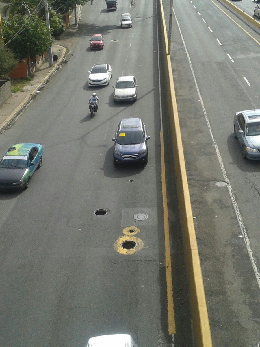 Santo Domingo Este hoy en la autopista la América serca al hospital Dario Contrera casi debajo del pueste peatonal hay unos tremendo oyó que puede producir un accidente muy grave a la autoridades favor corregir esto en muchas ocaciones se ven esto problema tiene que buscar la solución definitiva a este problema debe haber una forma x porque la población sabe que se roban las tapa es verdad pero esto no puede seguir sucediendo para eso están la autoridad