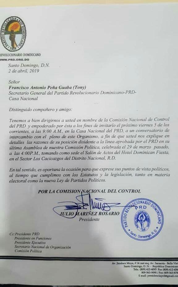 República Dominicana (Santo Domingo) El Partido Revolucionario Dominicana (PRD) en un documento o carta pública cita para el 5 de abril en la casa Nacional del PRD al Distiguido dirigente Secretario General Del PRD Tony Paña Guaba para preguntales sobre su últimas posiciones pública donde el en su declaraciones no está decuerdo con lo aprobado el 29 de marzo en la asamblea de la comisión politica máximo organismo del PRD para que el de una explicación porque está acción donde la comisión le dirá su parecer de dicha situación el PRD esta su peor crisis y división y ahora otros más incombeniente dentro de un partido que a perdido la mayoría veremos que pasará.