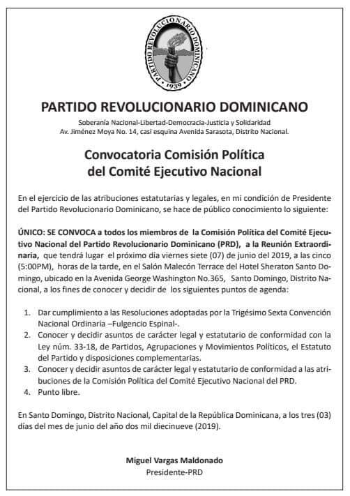 Convocatoria de la comisión politica del comité ejecutivo nacional del PRD hoy vienes 7 de junio 5:pm