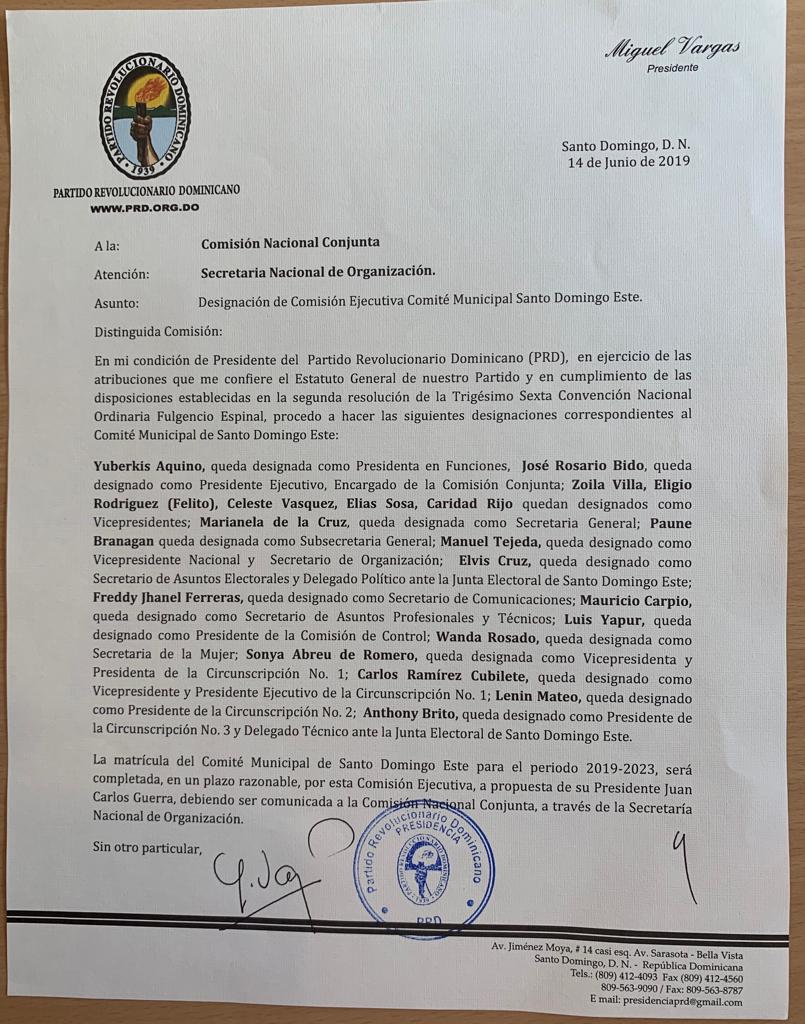 Con esta comunicación dirigida a la Comisión Nacional Conjunta con atención a la Secretaria General de Organización, el presidente del Partido Revolucionario Dominicano (PRD) Miguel Vargas Maldonado designa la nueva dirección municipal de esta organización politica en esta demarcacion, Primer partido en adeduar sus estutos de acuerdo a la nueva ley de regimen electoral y regimen de partido.