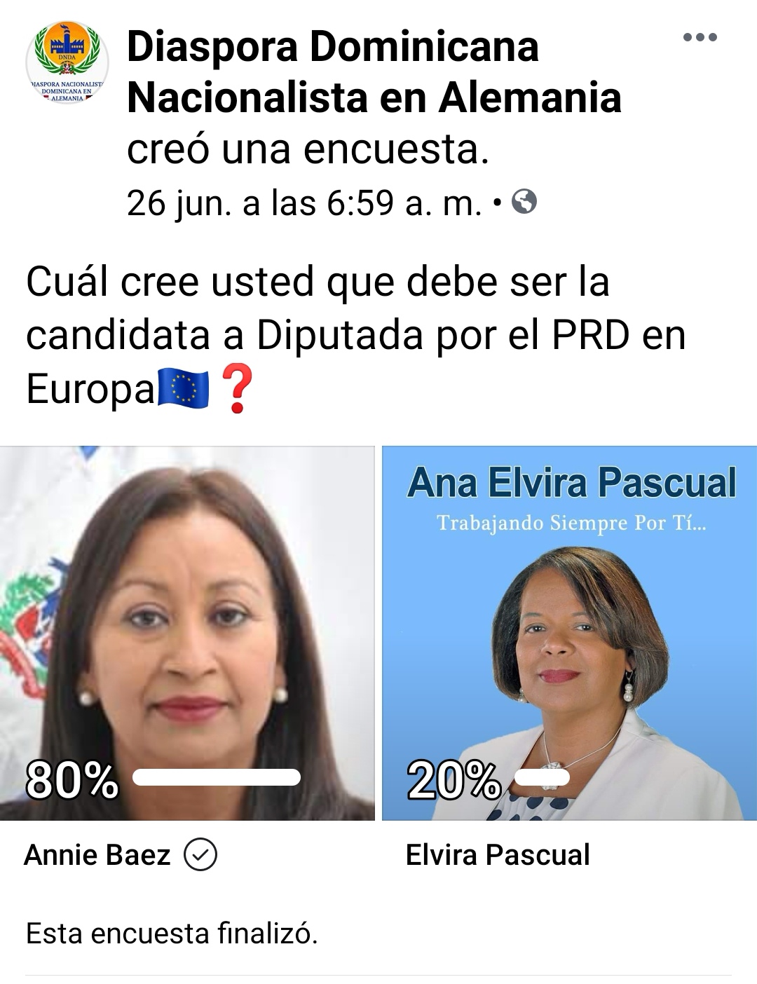 Annie Báez Santana Agradecemos infinitamente el apoyo suscitado a la última encuesta que se llevó a cabo en la página de Facebook Diáspora Dominicana Nacionalista en Alemania, en la cual obtuvimos el 80% de los votos publicados.