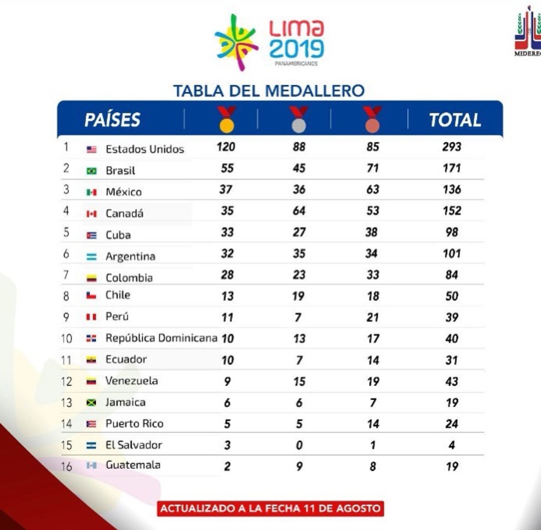 República Dominicana (Santo Domingo) la representación de los Dominicano fue en alto superando el triunfo en otras ocasiones ahora se implantó con más medalla que en otras ocasiones esto significa que la República Dominicana está creciendo y desarrollando en materia de deporte;un récord para República Dominicana 40 medalla 10 de oro 13 plata 27 Broncr Exelente trabajo del Comité olímpico Dominicano u en lima 2019.