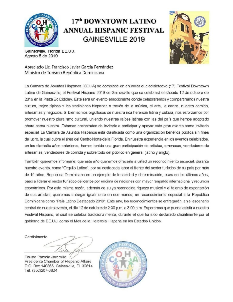 Gainesville, Fl.- Luego de varios días, en los cuales la Cámara Hispanoamericana de Comercio en los Estados Unidos (COHA) iniciara la promoción de la 17th celebracion del Festival Downtown Latino, pautado para el 12 de octubre, Día de la Raza, en esta ciudad, en la tarde de este lunes se emitió la primera invitación especial para recibir Distinciones y Reconocimientos, siendo el Ministro de Turismo de la República Dominicana, Francisco Javier García, el destinatario de la misma.