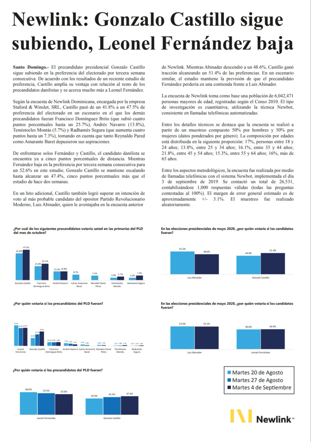 Consiga que Castillo también logró superar en intención de voto al más probable candidato del opositor Partido Revolucionario Moderno, Luis Abinader, quien le aventajaba en la encuesta anterior de Newlink.