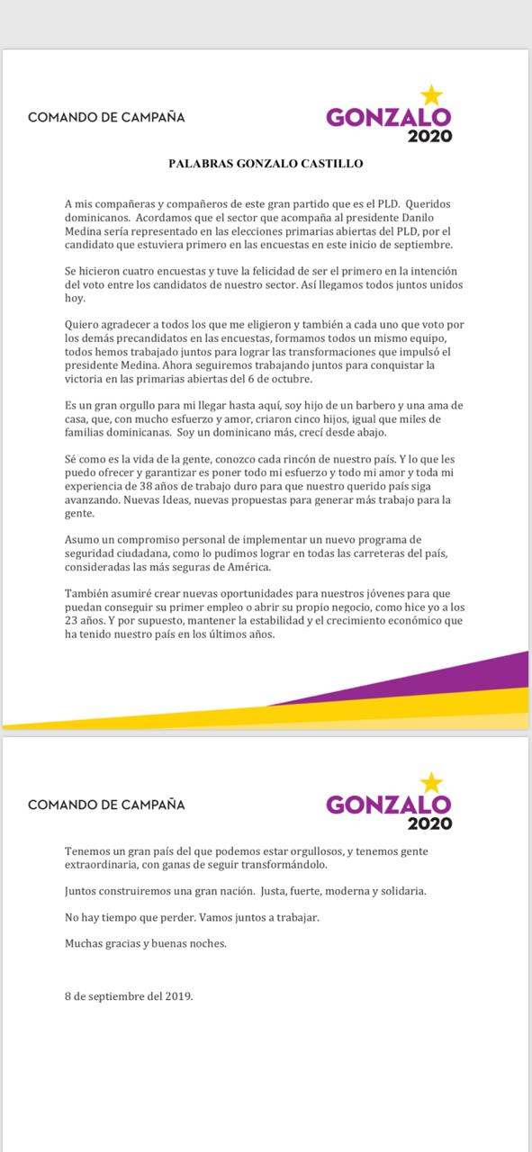 República Dominicana (Santo Domingo)- En varios canales televisión a las 8:pm luego repetición a la 10:pm en otros canales breves minuto Gonzalo Castillo se dirige al país.