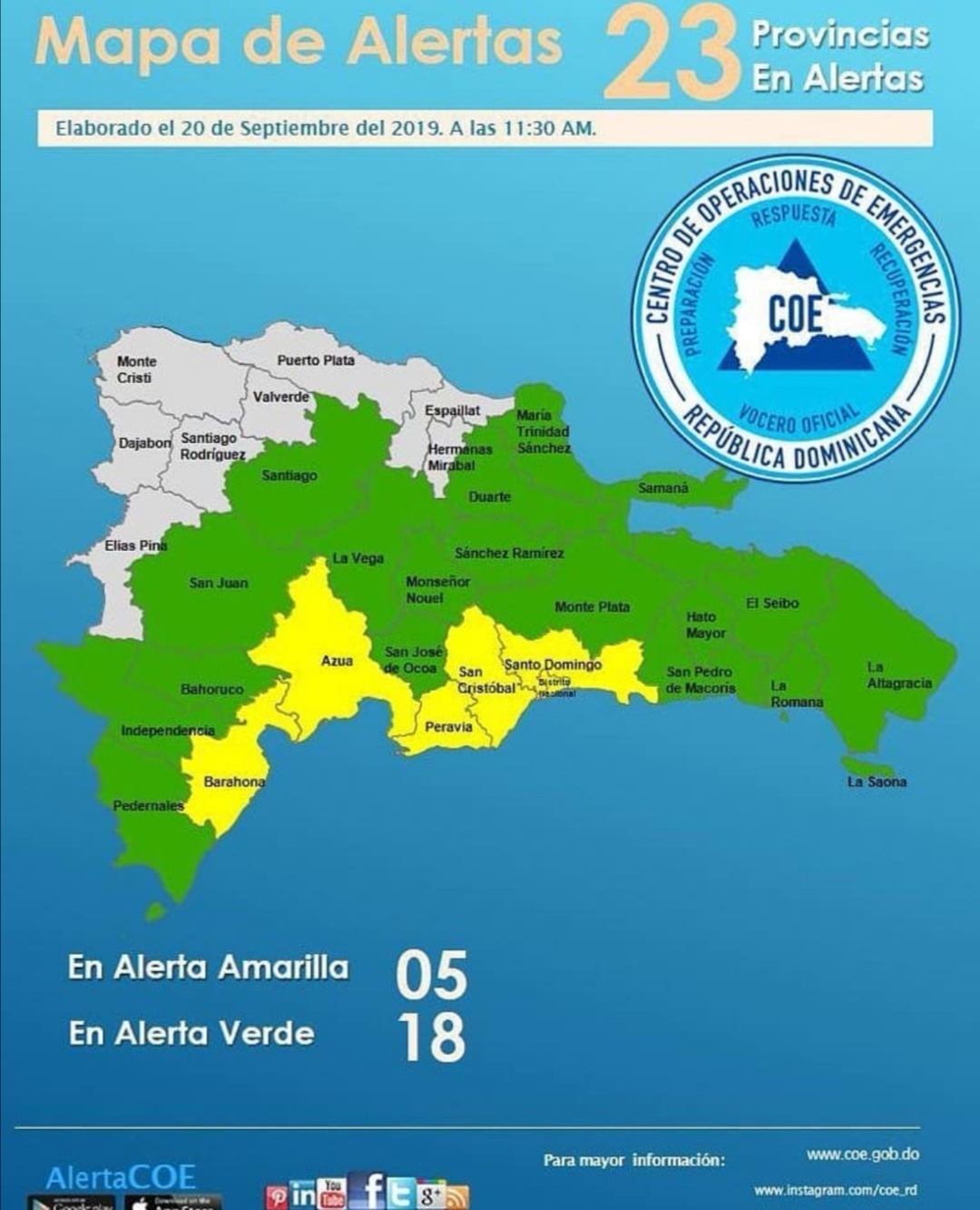 República Dominicana (Santo Domingo) alerta 5 provincia amarilla 18 verde atención a los organismos correconviente el COE y metrologia