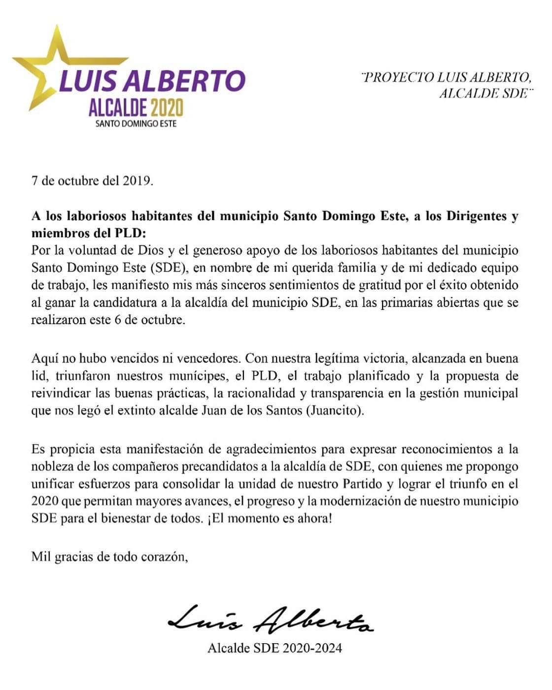Comunicado: del proyecto a la alcaldía Luis Alberto Tejeda Próximo Alcalde de Santo Domingo Este.