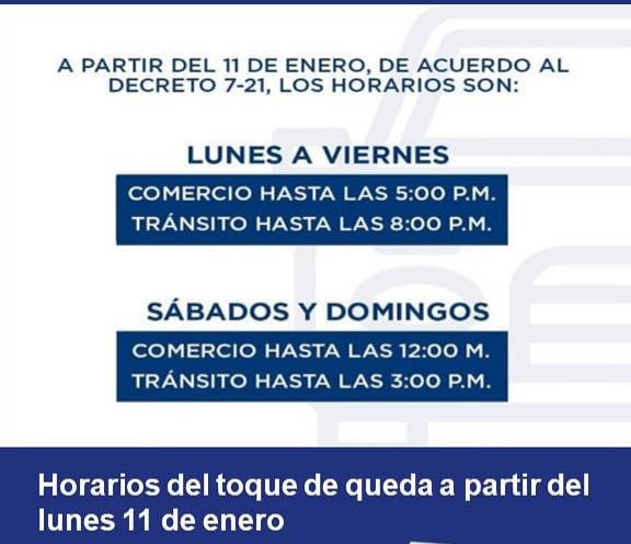 El toque de queda de lunes a vienes será de 5:00 pm con libre circulación de tres hora hasta 8:pm luego no hay circulación hasta la 5:00 am.