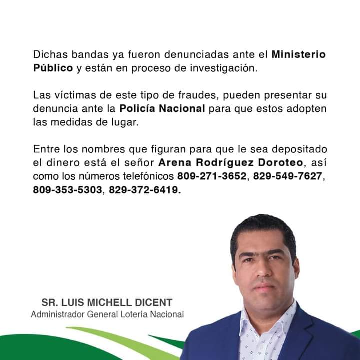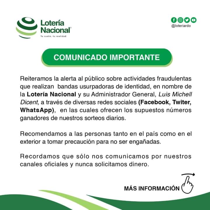 Reiteramos la alerta al público sobre actividades fraudulentas que realizan bandas usurpadoras de identidad, en nombre de la Lotería Nacional y su Administrador General, Luis Michell Dicent, a través de diversas redes sociales (Facebook, Twitter, WhatsApp), en las cuales ofrecen los supuestos números ganadores de nuestros sorteos diarios.