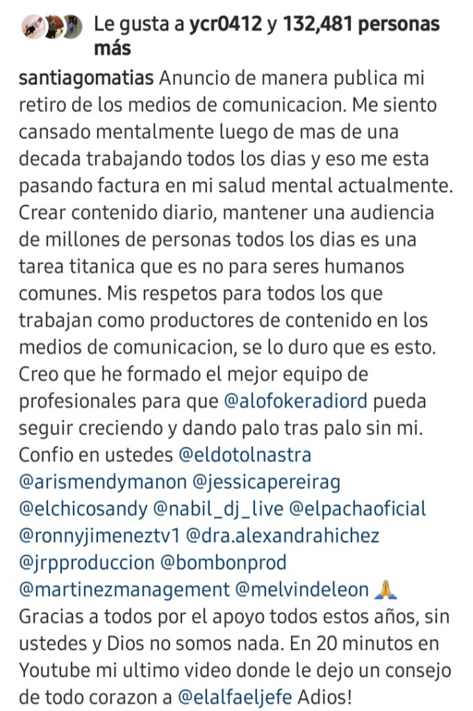 En la publicación, Santiago Matias agradeció además el apoyo recibido en estos años, Así mismo mostro su respecto a todos los que trabajan como productores de contenido en los medios de comunicación. Se recuerda que días atrás había circulado la información de que este en conjunto con el artista urbano Ozuna habría comprado la emisora Sonido Suave.