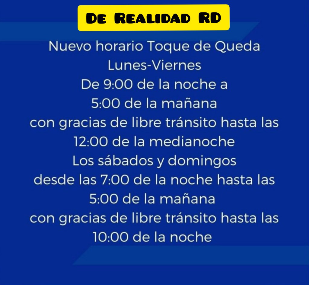 República Dominicana -(Santo Domingo)- El Gobierno estableció nuevo horario de toque de queda a partir del 3 de marzo en horario de lunes a viernes desde la 9:00 de la noche hasta la 5:00 de la mañana; Sábado y Domingo desde la 7:00 de la noches hasta las 5:00 am.