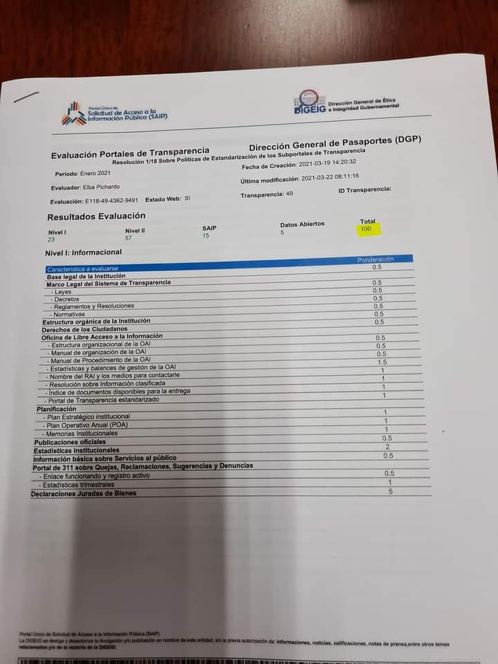 Al valorar la transparencia de una gestión en una institución del estado hay que tomar en cuenta vario aspectos, el sacar la máxima valoración, es gran existo que tiene que llenar de orgullo a su Director General DR: Néstor Julio Cruz Pichardo felicitamos a este director por sus logro en tan poco tiempo poniendo un ejemplo de una buena gestión; a si mismo felicitamos a todos los servidores publico que son partes de esa gestión ejemplar de la Dirección general De Pasaporte en hora buena el cambio en esa institución publica esta asegurado con la manos ejemplar de unos buenos servidores publico; De la gestión del Gobierno del cambio excelentísimo Presidente Lic. Luis Abinader.