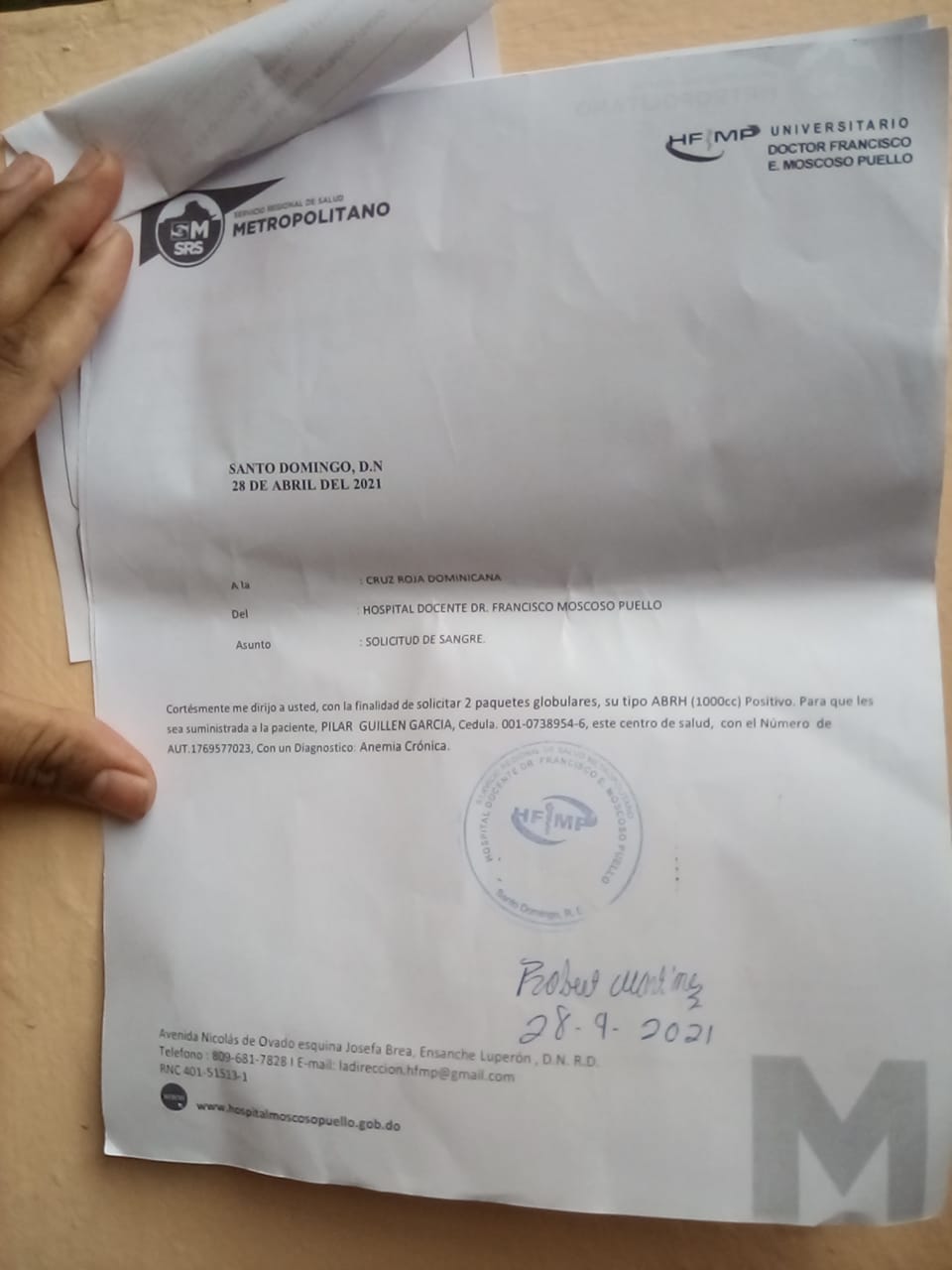 República Dominicana-(Santo Domingo)- Hola gente no consigo 2 donantes para mí madre tiene anemia crónica desde el 28 de Abril en el Moscoso Puello le indicaron que tiene que recibir 2 transfusiones de sangre AB Rh positivo o si no puede morir porque tiene anemia crónica la tengo en la casa porque no tienen camas en los hospitales entonces cuando tenga las 2 pintas de sangre iré al hospital con ella. Mi celular es 809-416-7702 Por Christian Israel Feliz