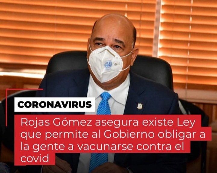La Ley General de Salud 42-01 obliga a que la gente se vacune, ningún ciudadanos de República Dominicana que esta regido por esa Ley tiene derecho a enfermar a otro y cuando se manda a que en caso de situaciones extremas como esta, no solamente la ley 42-01 le da potestad a la autoridades sanitaria y a la autoridad nacional, sino un mandato de una situación de excepción que ha sido aprobado por el congreso dijo Rojas Gómez.