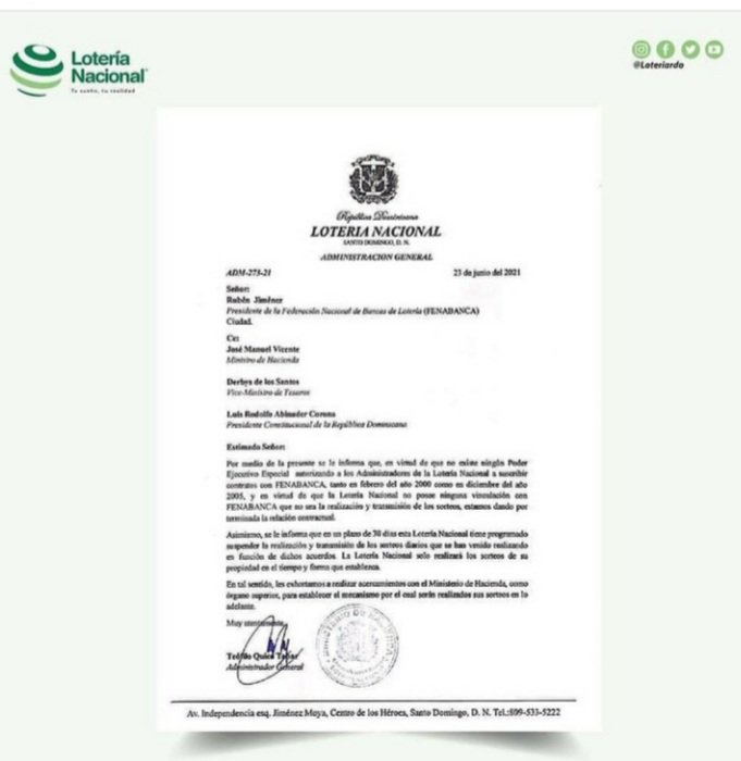 En una carta enviada el pasado 23 de junio al presidente de Fenabanca, Rubén Jiménez la Lotería precisa que no existe ningún poder ejecutivo especial ni contrato suscrito con Fenabanca, por tal razón dio por terminada la relación para la transmisiones de los sorteos.