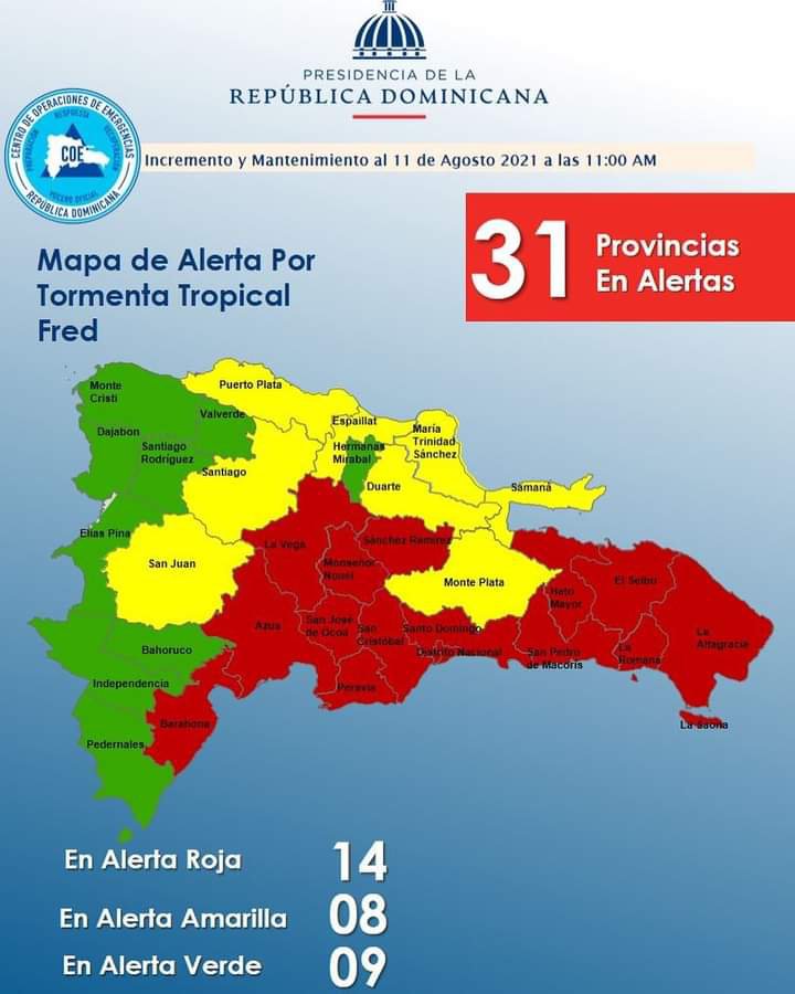 El COE aumenta a 14 las provincias en alerta roja y mantiene al resto del país bajo alerta por posibles crecidas de ríos, arroyos y cañadas, así como inundaciones repentinas o urbanas debido a que la tormenta tropical Fred ya se encuentra muy próximo a la isla Saona y de acuerdo a las imágenes satelitales, la nubosidad asociada está produciendo lluvias en La Altagracia, Isla Saona y Boca de Yuma, así como otras localidades cercanas.