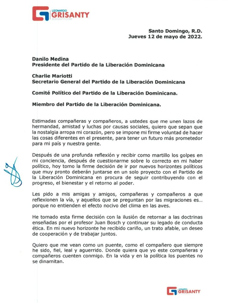 Después de una profunda reflexión y recibir como martillo los golpes en mi conciencia, después de cuestionarme sobre lo correcto en mi haber político, hoy tomo la firme decisión de ir por nuevos horizontes políticos que muy pronto deberán juntarse en un solo proyecto con el Partido de la Liberación Dominicana en procura de seguir contribuyendo con el progreso, el bienestar y el retorno al poder.