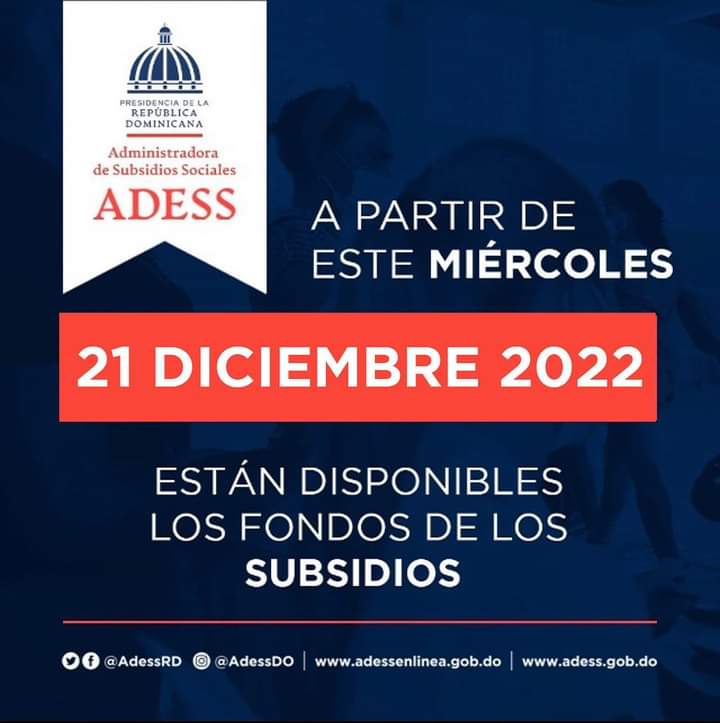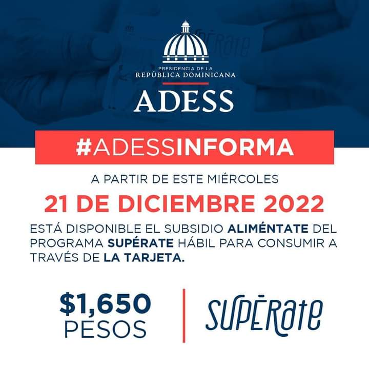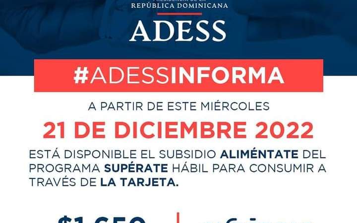 Repùblica Dominicana- AdessInforma a las personas beneficiarias del programa Supérate, hábiles para consumir con tarjeta, que desde este miércoles 21 de diciembre, están disponibles los fondos del programa ALIMÉNTATE, por un pago único del 1,650 pesos.