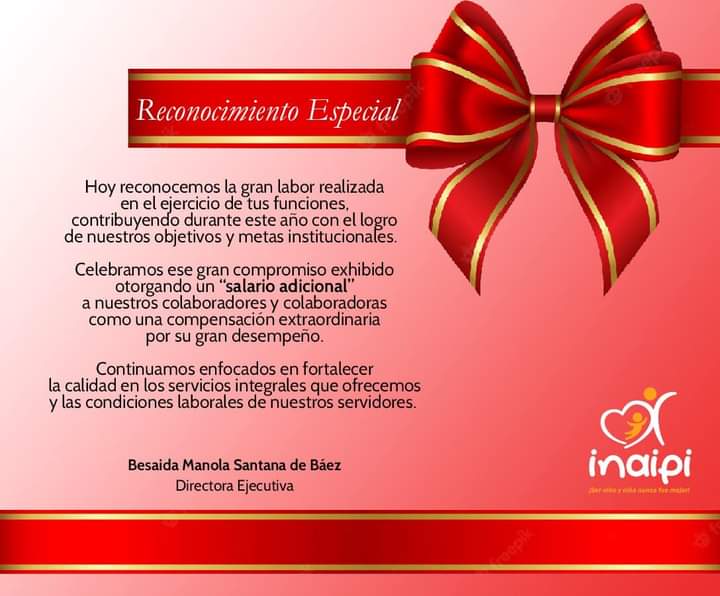 Repùblica Dominicana-(Santo Domingo)- Es un Reconocimiento Especial a la Directora Ejecutiva Besaida Manola Santana De Bàez Del (Inaipi) Durante este año 2022 el Inaipi cumplió con los compromisos dispuestos en la ley 105-13 sobre Regulación Salarial y compensaciones por desempeño, conforme a lo establecido con nuestros colaboradores y colaboradoras.