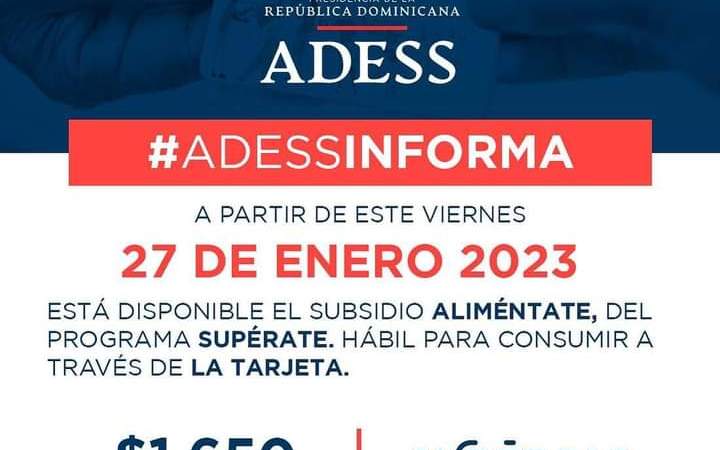 Repùblica Dominicana- Administradora De Subsidios Sociales (Adess) Informa a las personas beneficiarias del programa Supérate, hábiles para consumir con tarjeta, que desde este viernes 27 de enero, están disponibles los fondos del programa ALIMÉNTATE, por un pago único del 1,650 pesos.