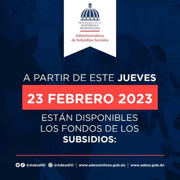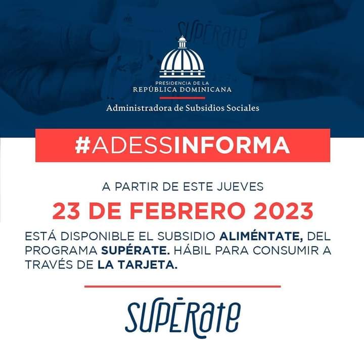 República Dominicana- Administradora de Subsidios Sociales (Adess) Informa a las personas beneficiarias del programa Supérate, hábiles para consumir con tarjeta, que desde este jueves 23 de febrero, están disponibles los fondos del programa ALIMÉNTATE, por un pago único del 1,650 pesos.