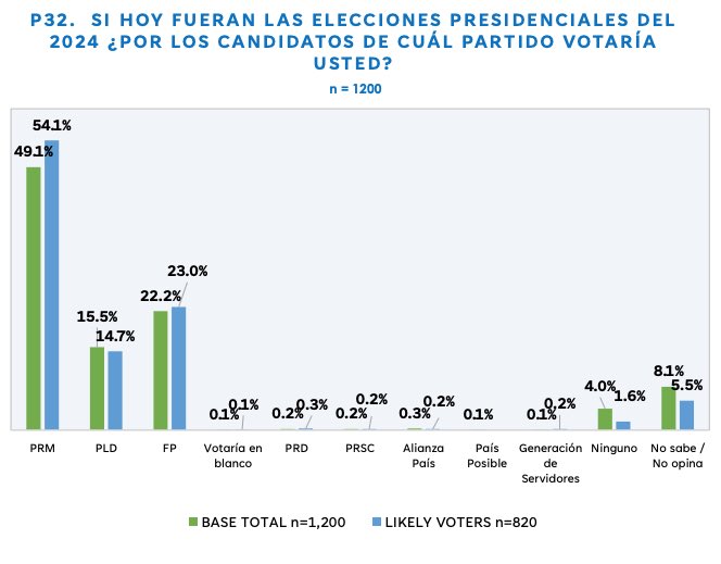Si hoy fueran las elecciones presidenciales el 54.1% de la población votaría por el Partido Revolucionario Moderno PRM, el 23.0% por la Fuerza del Pueblo FP y 14.7% por el Partido de la Liberación Dominicana PLD.