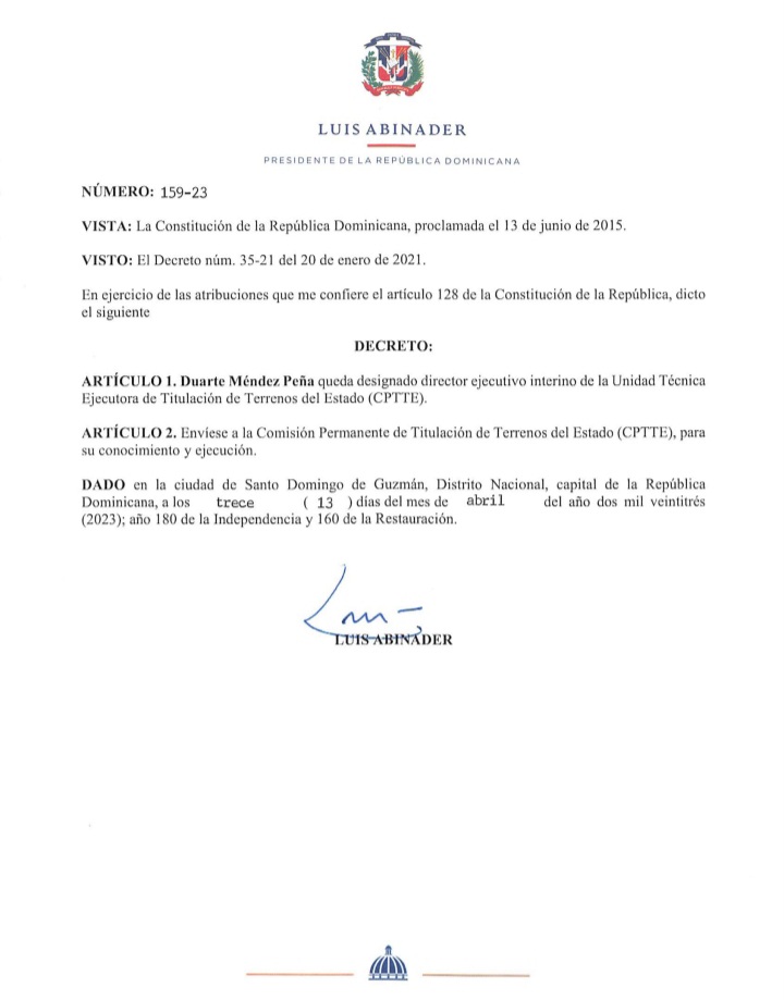 Repùblica Dominicana-(Santo Domingo)- El presidente Luis Abinader mediante el decreto 159-23 designó a Duarte Méndez Peña como director ejecutivo interino de la Unidad Técnica Ejecutora de Titulación de Terrenos del Estado (UTECT).