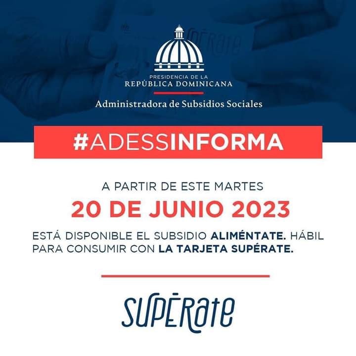 República Dominicana- Atención a toda la población que esta harta o hábiles para consumir; los programa del gobierno dominicano la Administradora de subsidio (ADESS) Informa a las personas beneficiarias del programa Supérate, hábiles para consumir con tarjeta, que desde este martes 20 de junio, está disponible los fondos del programa ALIMÉNTATE, por un pago único de 1,650 pesos.