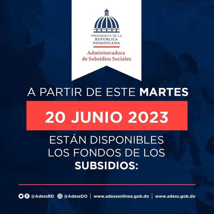 Tambien la Administradora de Subsidio (ADESS) Informa a las personas beneficiarias de los programas de Incentivos, CONAPE, PIAARD e IES, OPORTUNIDAD1424, y Bono Combustuble Motoben, están disponibles los fondos a partir de este jueves 20 de junio.