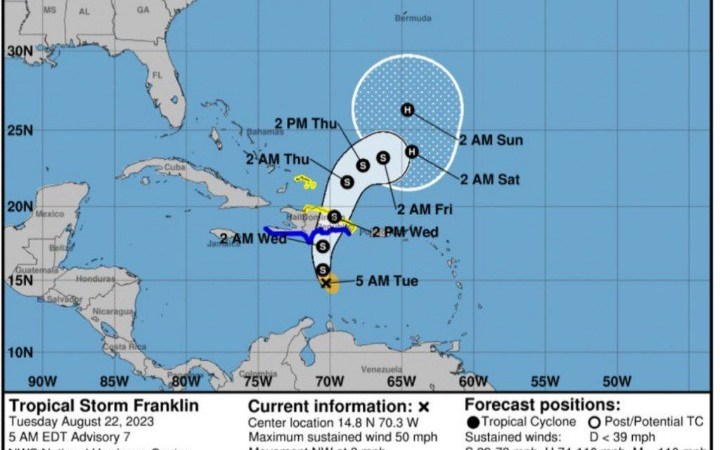 Mañana miércoles, la tormenta tropical Franklin incidirá directamente sobre la República Dominicana desde tempranas horas matutinas, produciendo aguaceros intensos y frecuentes, tormentas eléctricas y ráfagas de viento muy fuertes sobre gran parte de la geografía nacional.