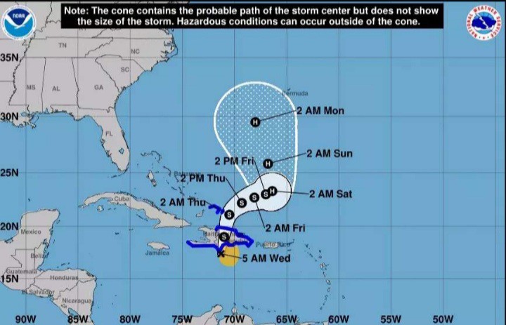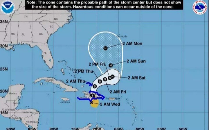 Según la trayectoria se espera el centro de Franklin cruce la isla Hispaniola hoy sobre aguas del suroeste del Atlántico, más tardar esta noche.