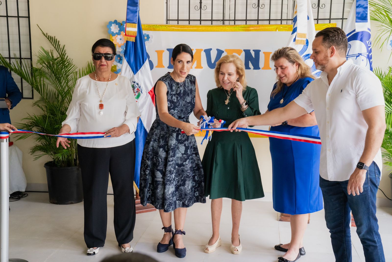 La primera dama Raquel Arbaje, presidenta honorífica del Gabinete, junto a Besaida Manola Santana, directora ejecutiva del INAIPI y las señoras Lian Fanjul y Lyanne Azqueta Fanjul, encabezaron el acto de inauguración del nuevo CAIPI, que cuenta con cuatro salas para ofrecer los servicios a los niños y las niñas, bajo el modelo del INAIPI.