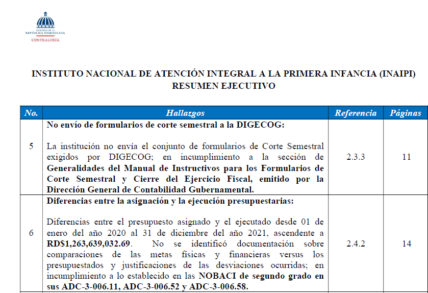 En dicho trabajo periodístico, se hace referencia a una «inconsistencia» ascendente a RD$1,263,639,032.69 millones de pesos en la ejecución presupuestaria del Instituto Nacional de Atención Integral a la Primera Infancia (lnaipi), institución que me honra dirigir, por disposición del Sr. Presidente de la República, Luis Abinader.