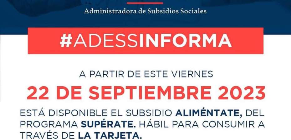 Adess Informa a las personas beneficiarias del programa Supérate, hábiles para consumir con tarjeta, que desde este viernes 22 de septiembre, está disponible los fondos del programa.