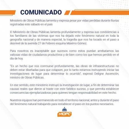 Ministerio de Obras PΓΊblicas lamenta y expresa pesar por vidas perdidas durante lluvias registradas este sΓ‘bado en el paΓs