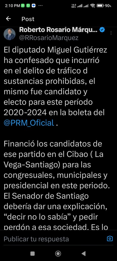 “Está acusado de financiar a los candidatos de su partido en el Cibao (La Vega-Santiago) para las elecciones congresuales, municipales y presidenciales de este período. El senador de Santiago debería dar una explicación, admitir que ‘no lo sabía’ y pedir perdón a la sociedad. Es lo mínimo. Dejemos de tratar de justificar lo injustificable”, publicó el político en su cuenta de X, antes conocida como Twitter.