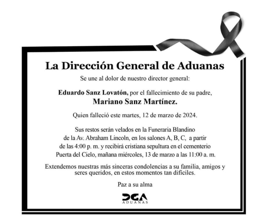 República Dominicana-(Santo Domingo)-El padre del director de Aduanas, Mariano Sanz, falleció este martes, sin hasta el momento conocer la causa de su deceso.