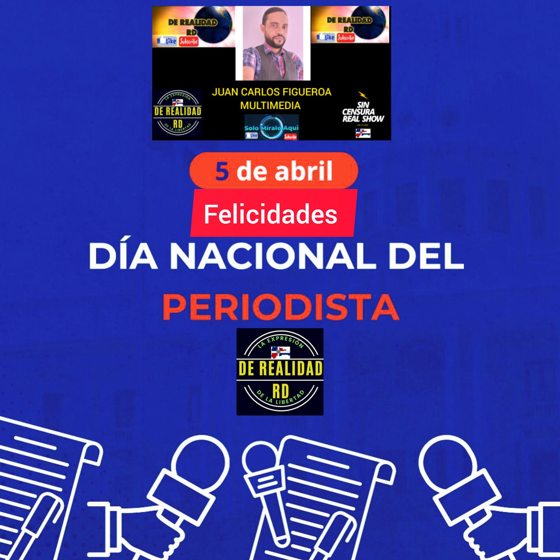 Felicidades a la clase periodista en su día; la persona que informa o comunica o investiga toda la información del día a día en la República Dominicana para suministrar a todo el pueblo dominicano de las más importantes informaciones nacionales o internacionales; muchas felicidades con muchas bendición de Dios a todos incluyendo la vieja era y la nueva era digital que se complementan; en una sola información veraz y creíbles con honestidad y mucha profesionalidad.