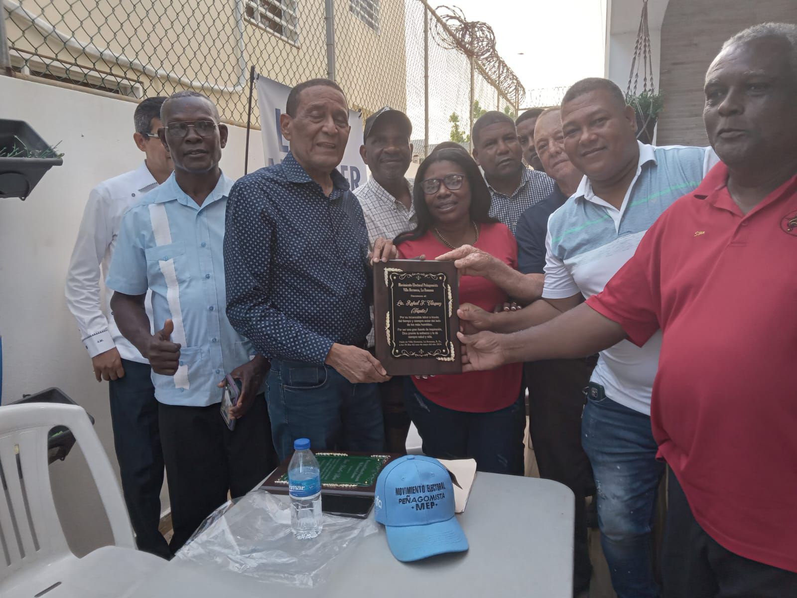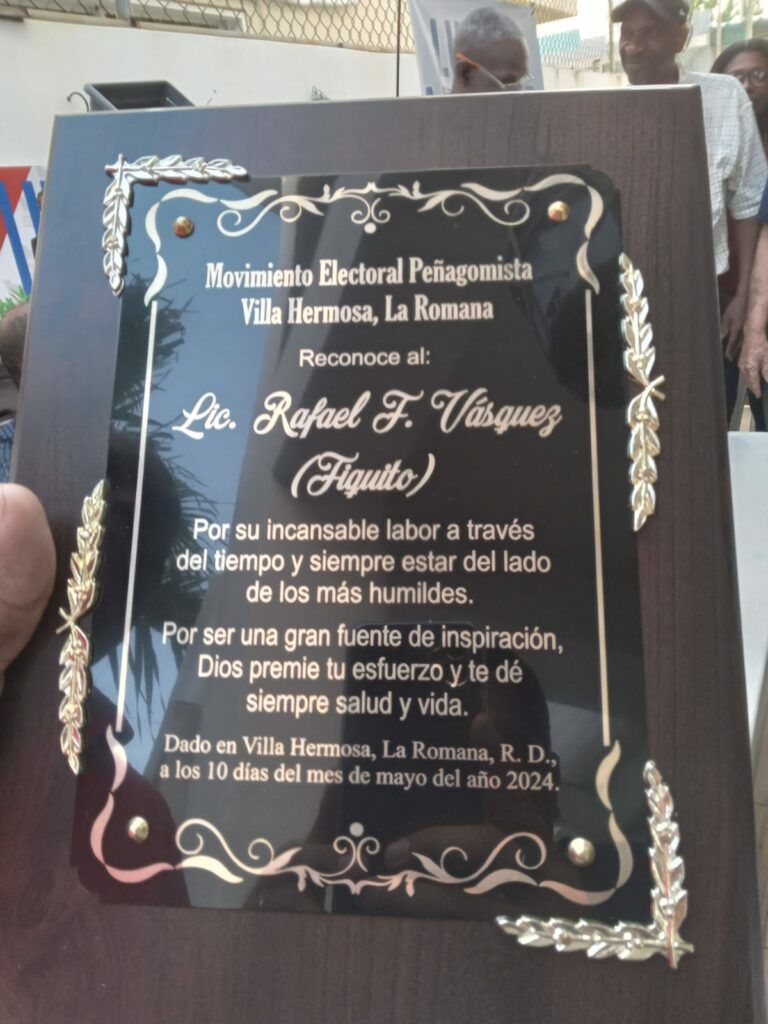 “Se hizo hincapié en seguir fortaleciendo el MEP desde las bases, lo que nos permitirá aportar una gran cantidad de votos para la victoria de Abinader y los candidatos a senadores y diputados en cada una de las provincias y del Distrito Nacional, y lo propio estamos haciendo en las circunscripciones del exterior, principalmente en Estados Unidos y Europa”, expresó.La placa entregada a Fiquito Vásquez en Villa Hermosa.