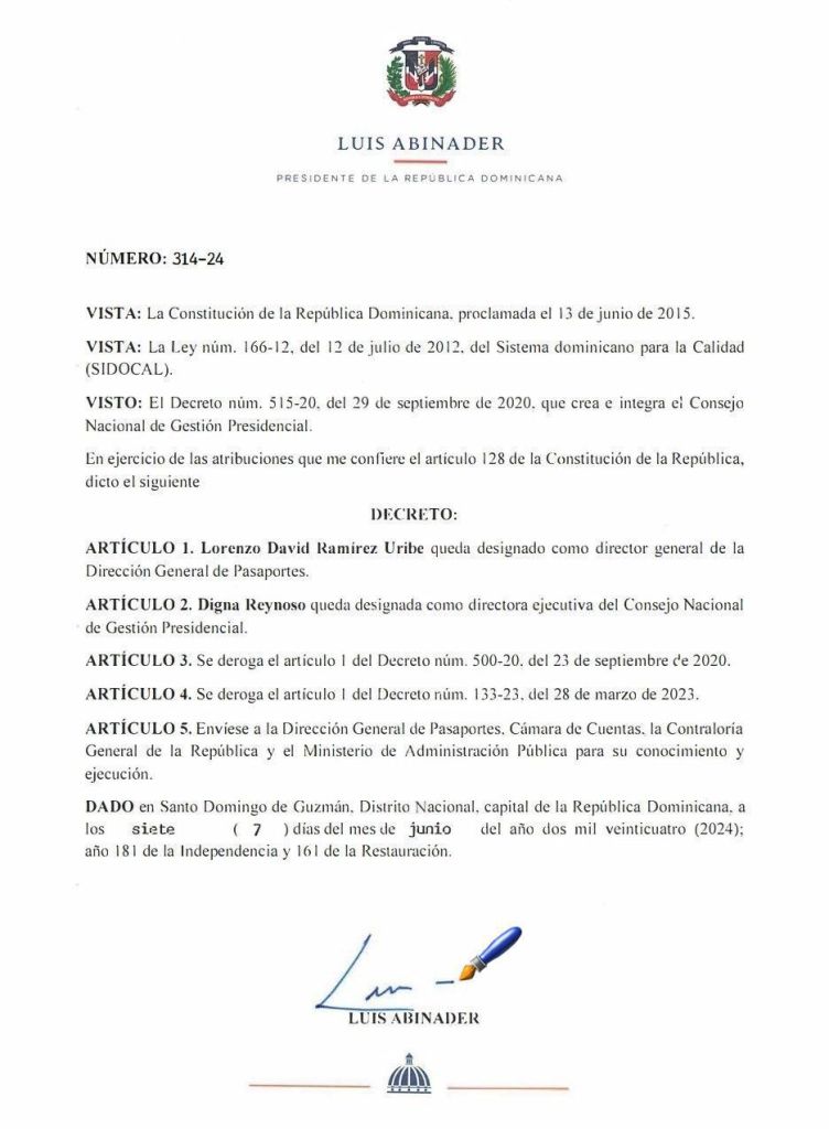 República Dominicana-(Santo Domingo)- El presidente Abinader emitió el decreto 314-24, mediante el cual designa a Lorenzo David Ramírez Uribe como director general de la Dirección General de Pasaportes, en sustitución de Digna Reynoso.