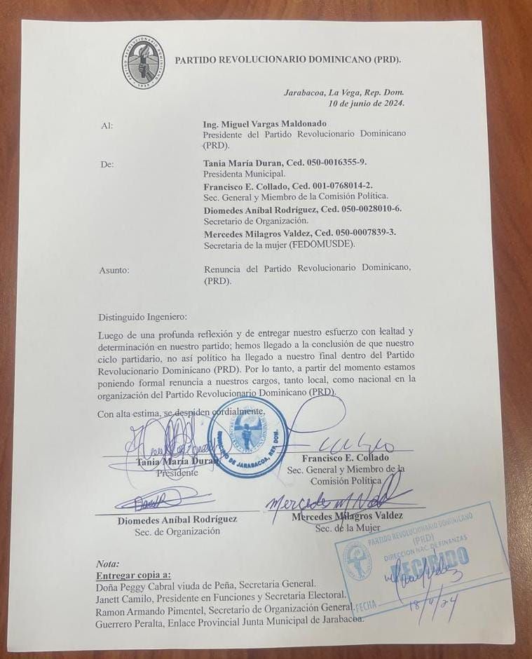 La Renuncia del Partido Revolucionario Dominicano (PRD) de esta alta Dirigencia del municipio de Jarabacoa la Vega llega a la Conclusión De No seguir militando en dicha organización y estarán un momento de reflexión como político analizando sus siguientes paso en la política Dominicana.