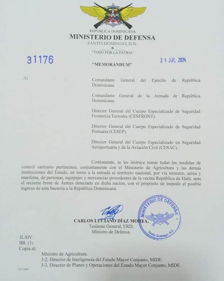 República Dominicana-(Santo Domingo)- El Ministerio de Defensa anunció la noche de este domingo la adopción de medidas preventivas de seguridad para proteger a la población ante la sospecha de brote de ántrax en territorio de Haití.
