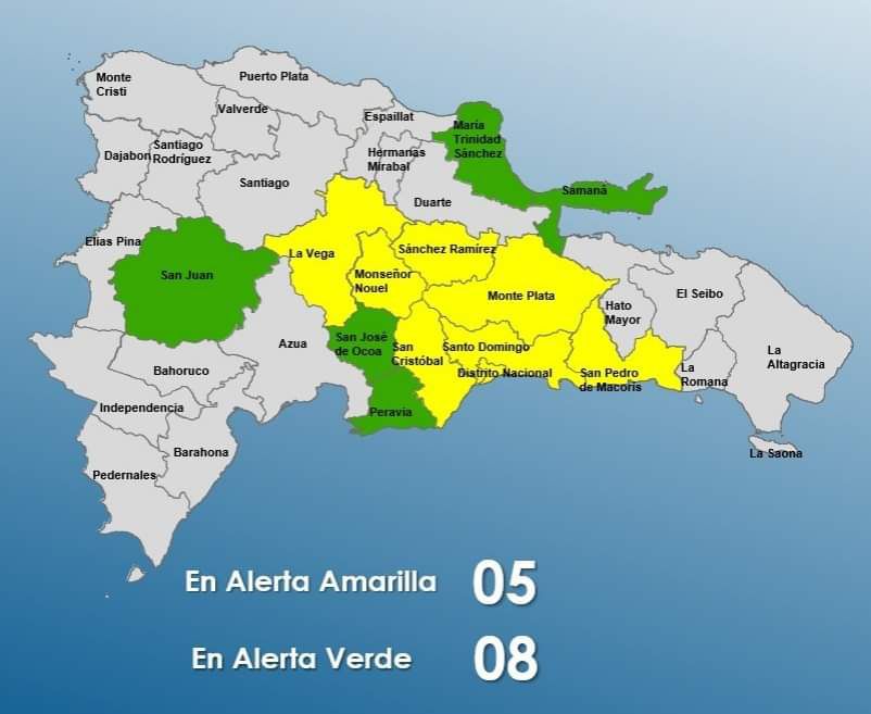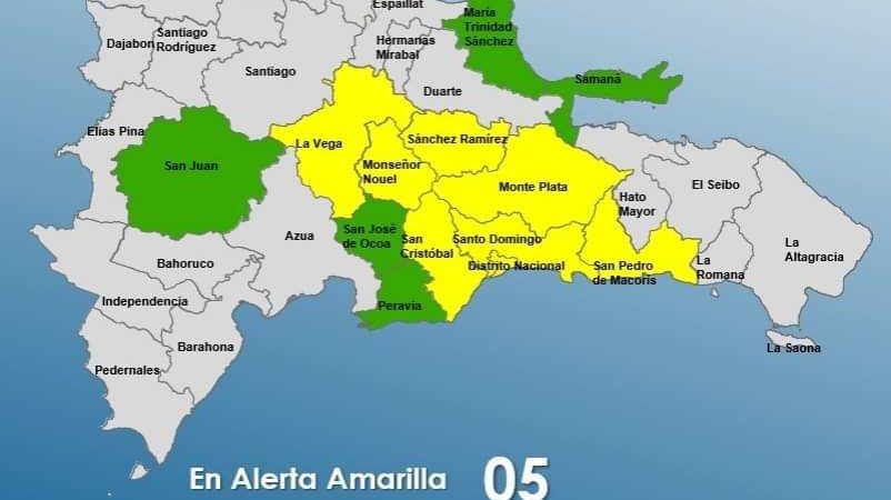 El COE aumenta 07 provincias y al Distrito Nacional en alerta amarilla y mantiene 05 en verde, debido a que una activa onda tropical en combinación con una vaguada estarán generando aguaceros moderados localmente, principalmente hacia las regiones suroeste, este, zona fronteriza y áreas colindantes a la Cordillera Central.