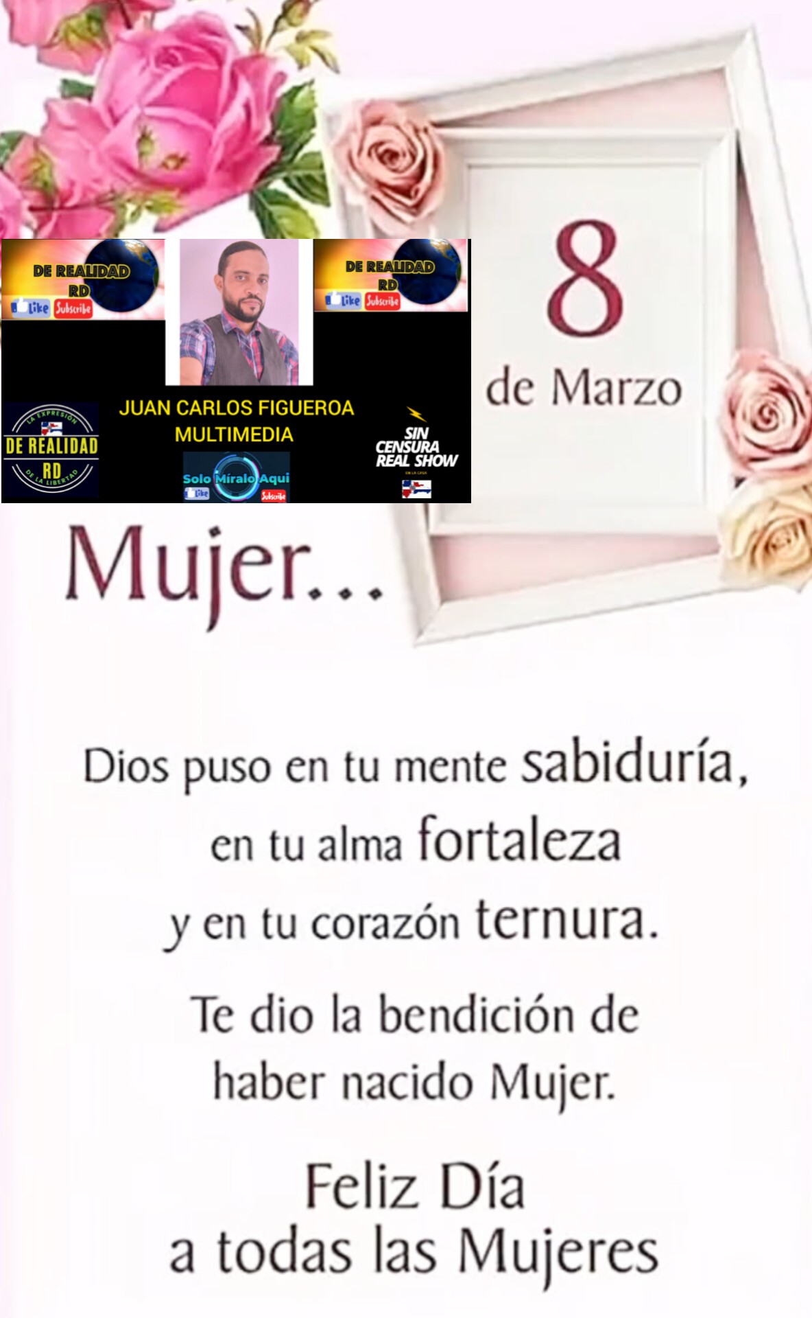 A ti mujer ser maravilloso en la fa de la tierra en tu día especial felicidades; aunque para mí yo creo que todos lo día son día de la mujer; hay que amarla, adorarla y sentirla siempre o cuidarla siempre; porque todos somos un producto en esta vida por la vía de una mujer; no la maltrate nunca, vuélvete loco amandola siempre la mujer es como una flor linda y hermosa y delicada cuidarla siempre no la machiste nunca recuerda que todos tenemos madres o hermana o hija que Dios la bendiga siempre a la mujer.