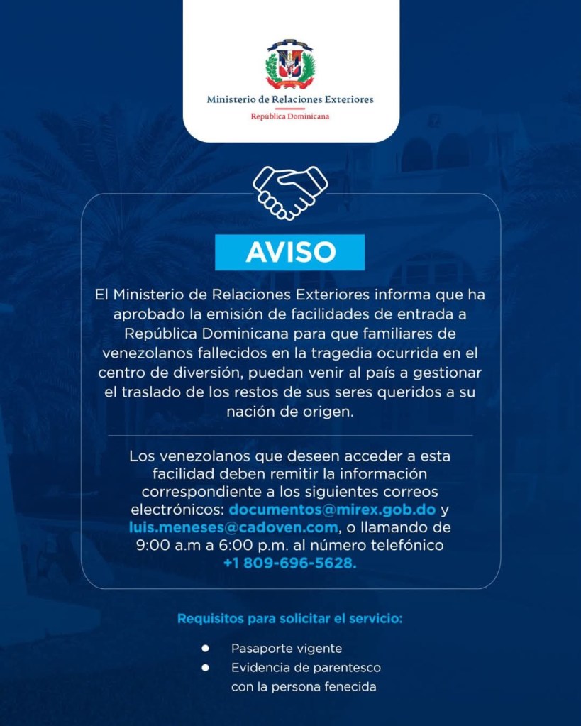 Republica Dominicana-(Santo Domingo)- El Ministerio de Relaciones Exteriores informa que ha aprobado la emisión de facilidades de entrada a República Dominicana para que familiares de venezolanos fallecidos en la tragedia ocurrida en el centro de diversión, puedan venir al país a gestionar el traslado de los restos de sus seres queridos a su nación de origen.