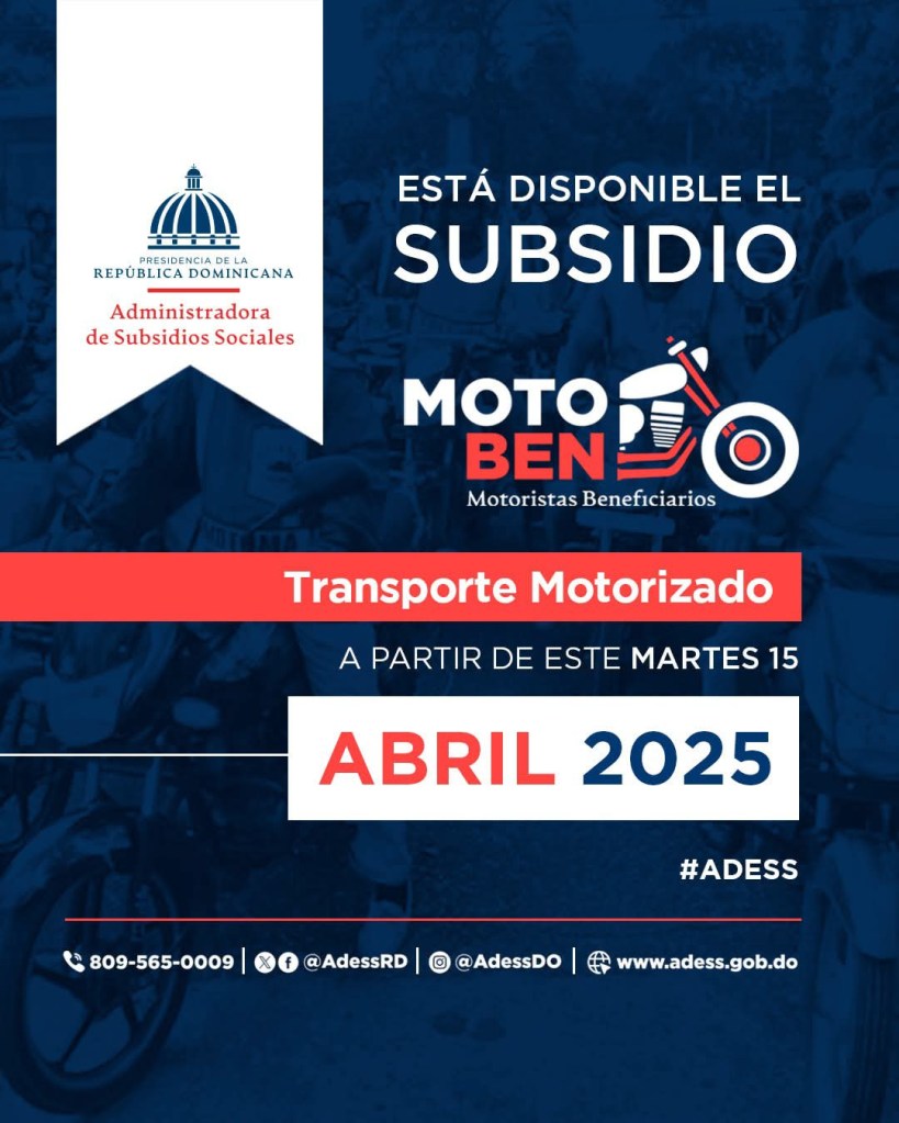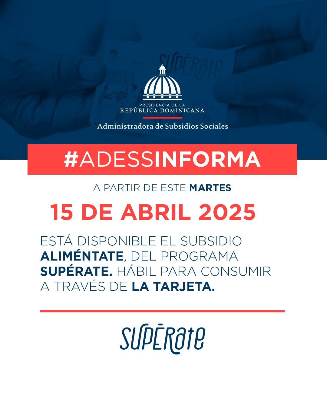 Republica Dominicana-(Santo Domingo)- La Administradora De Subsidio Sociales (Adess) Informa a las personas beneficiarias del programa Supérate que los fondos del programa ALIMENTATE, correspondientes al mes de abril, están disponibles para su consumo con tarjeta, por un pago único de 1,650 pesos.