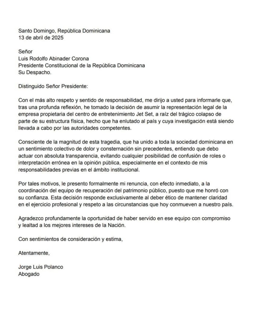 “Con el más alto respeto y sentido de responsabilidad, me dirijo a usted para informarle que, tras una profunda reflexión, he tomado la decisión de asumir la representación legal de la empresa propietaria del centro de entretenimiento Jet Set, a raíz del trágico colapso de parte de su estructura física, hecho que ha enlutado al país y cuya investigación está siendo Ilevada a cabo por las autoridades competentes”, escribió Polanco en una carta enviada al presidente de la República, Luis Abinader.