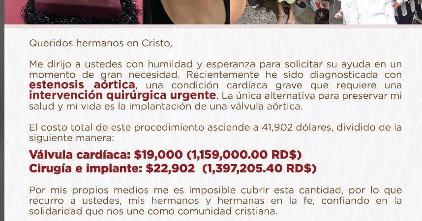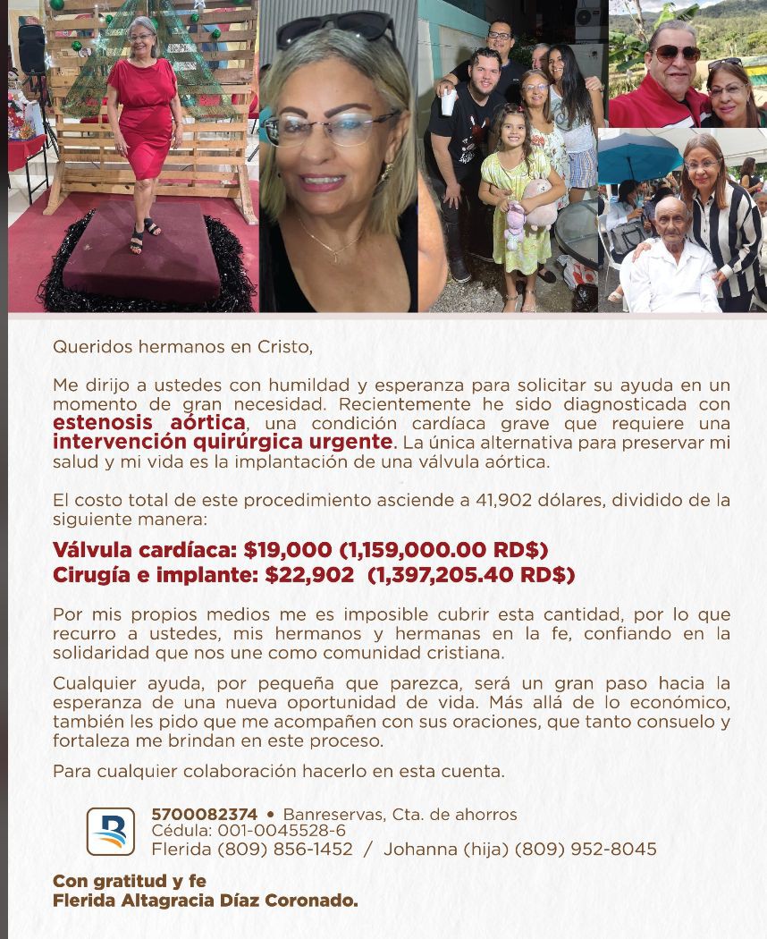 Mi nombre es Flerida Díaz y recientemente he sido diagnosticada con estenosis aórtica, una condición cardíaca grave que requiere una intervención quirúrgica urgente. La única alternativa para preservar mi salud y mi vida es la implantación de una válvula aórtica.